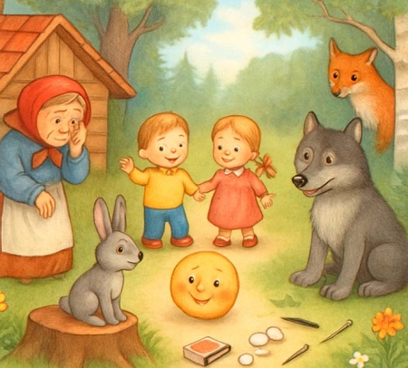 Бабушка: Ой, внучата, беда! Испекла я колобок, а он от нас укатился. Наверное, в лесу заблудился. Помогите найти колобка, как бы с ним не случилась беда!