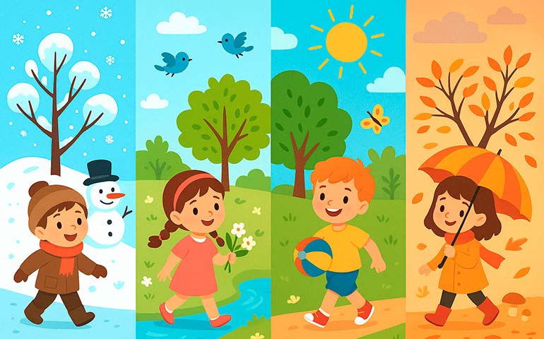 Дети путешествуют по временам года: зима, весна, лето, осень