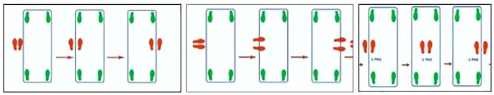 Прыжки выполняются медленно - одно слово - один прыжок. Прыжки совершаются согласно схеме. Задача участника прыгать без ошибок, не задевая резиночку ногами. Если участник ошибается, в игру вступает следующий участник.