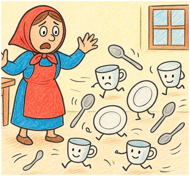 "Ребята, от меня сбежала вся посуда, я очень плохо с ней обращалась: не любила ее, и не мыла ее. Очень хочется вернуть посуду домой. Помогите мне ее найти и тогда: