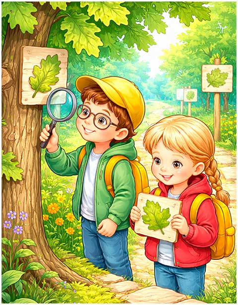 Вместе находят дерево, подходят к нему и сравнивают лист на картинке с листьями деревьев.