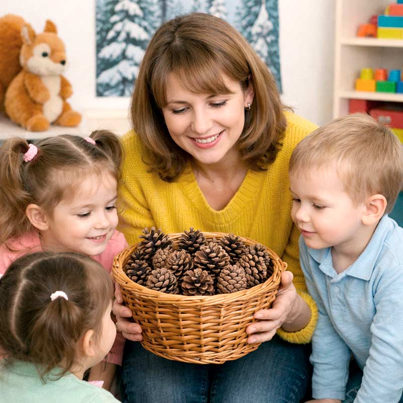 Перед началом можно дать детям потрогать шишки с закрытыми глазами — это усилит интерес и подключит тактильное восприятие.