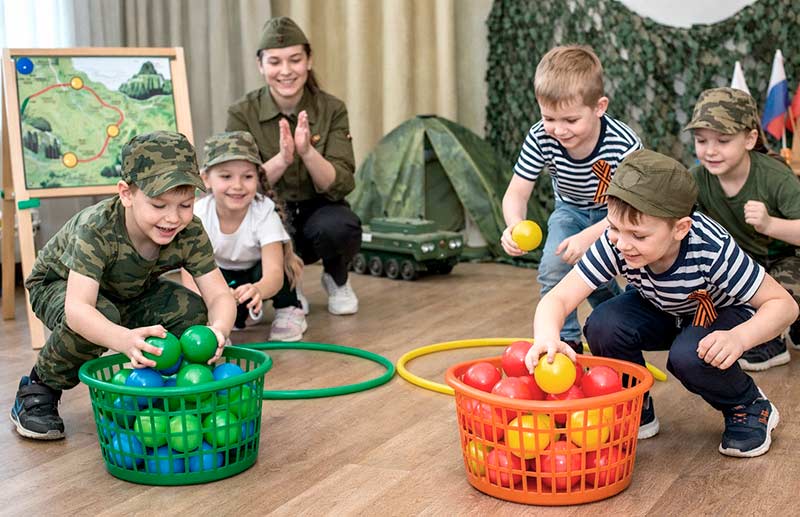 Дети: маршируют, стреляют из оружия, бегают с препятствиями на большие расстояния, ездят на военной технике, летают на военных вертолетах и самолетах, плавают на кораблях и подводных лодках, ездят на танках.