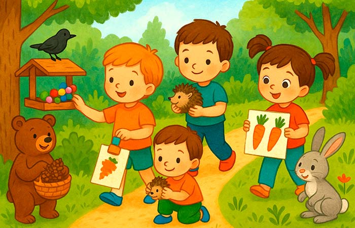- Птичка поклевала горошинки, сказала спасибо и приглашает в путешествие по лесу, там мы встретим разных животных!
