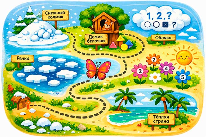 Бабочка начинает свое путешествие, и воспитатель передвигает ее по ватману. Каждое задание - это остановка на пути к теплой стране. После каждого выполнения задания дети продвигают бабочку вперед.