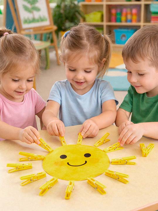 - Ребята, а давайте сделаем лучики солнышку. А с помощью чего мы сделаем лучики? (С помощью прищепок)