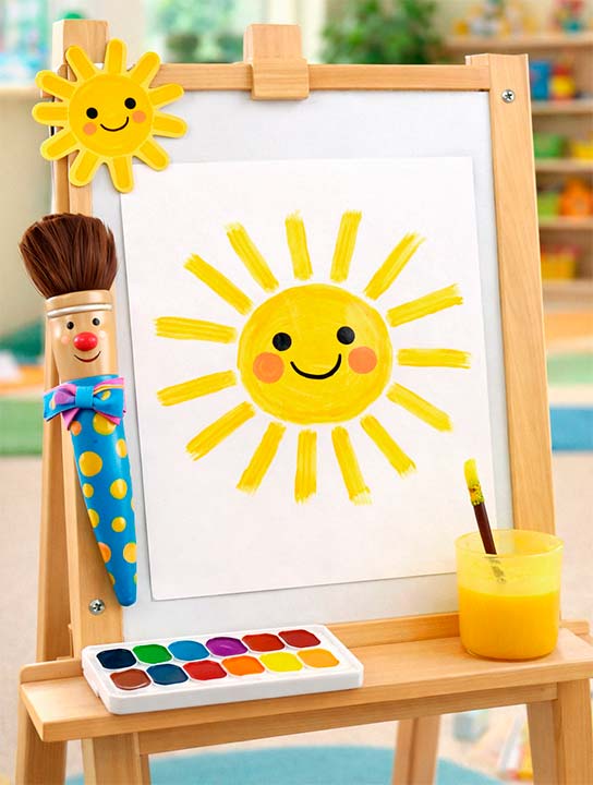 - Как нарисую, промываю кисточку в воде, вытираю о салфетку и положу подставку. Вот какое солнышко у меня получилось.