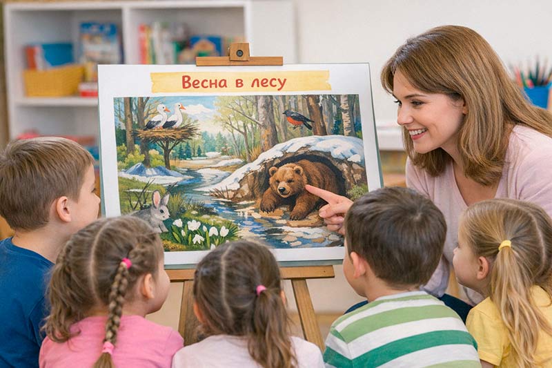 Занятие на тему "Весна в лесу" сочетает речевые упражнения, игровую активность и наблюдение, позволяя детям постепенно перейти от ответов на вопросы к самостоятельному рассказу.
