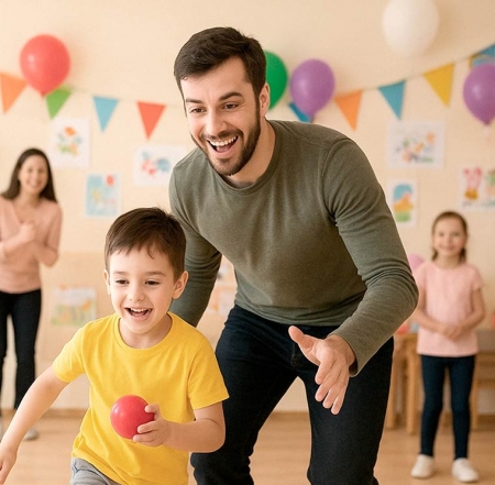 Дети и папы делятся на команды, выполняют задания: донести мячик в ложке, перепрыгнуть через обруч, передать эстафету.