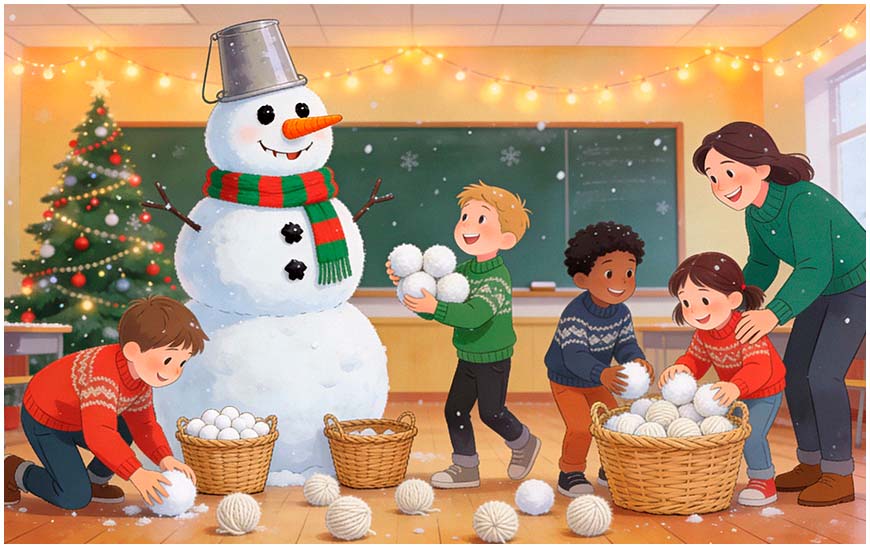 Снеговик: Мальки и девочки, вы знаете, что я очень люблю зиму и для того, чтобы я не грустил, предлагаю собрать снежки в мои корзинки.