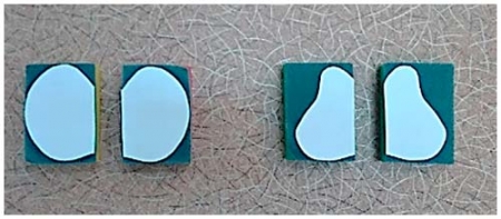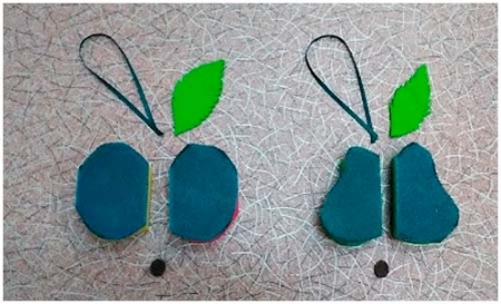 1. Берем 2 губки одного или разных цветов. Рисуем на губке (на ткани жесткой основы) силуэт яблока или груши. Можно использовать шаблон (1 половинка на одной губке, 2 половинка на второй губке).