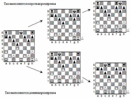 Рокировка бывает длинной и короткой. Если король рокируется с ближней ладьей - это короткая рокировка, а если с дальней (со стороны ферзя) – это длинная рокировка.