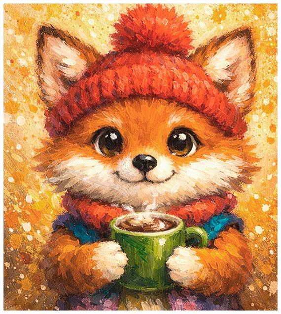 - Чтобы портрет был похож, нужно поймать характер Фоксика! Он забавный, немного пушистый, держит свою любимую кружку с горячим шоколадом. (Показываю изображение лисенка на экране или плакате)