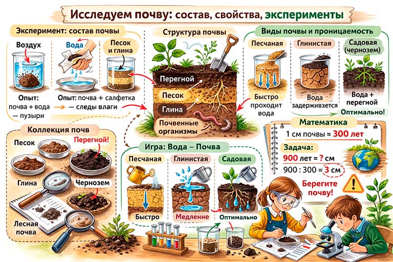 Проведите простой опыт по разделению почвы на составные части (вода, воздух, песок, глина, перегной) с помощью фильтрации и отстаивания. Важно, чтобы ученики сами провели эксперимент и сделали выводы.