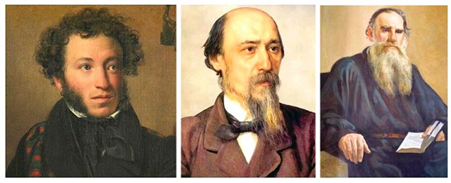- Перед вами портреты великих русских писателей и поэтов, может кто-нибудь знает автора услышанных строк и может нам его показать? (На доске портреты Пушкина, Толстого, Некрасова. Ученик указывает на Пушкина, остальные убираю)