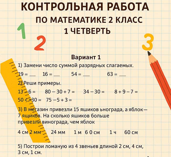 Контрольная работа по математике для 2 класса за 1-ю четверть предназначена для проверки усвоения основных тем начального курса: разрядный состав числа, действия сложения и вычитания, сравнение единиц измерения длины и времени, а также начальные представления о геометрических фигурах.