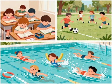 Правильный ответ: последний вариант, так как в диалоге один из детей говорит "I can swim" и они договариваются идти в парк, что может ассоциироваться с бассейном или водоемом.