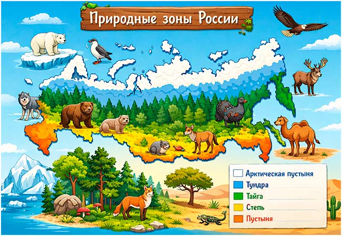 а) зона Арктических пустынь, зона смешанных и широколиственных лесов, тундра, зона пустынь, зона степей, тайга