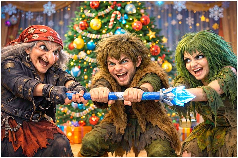 - От Деда все одно такая нечисть как мы подарков не дождемся. Я ему сейчас какую-нибудь гадость сделаю! (Машет посохом)