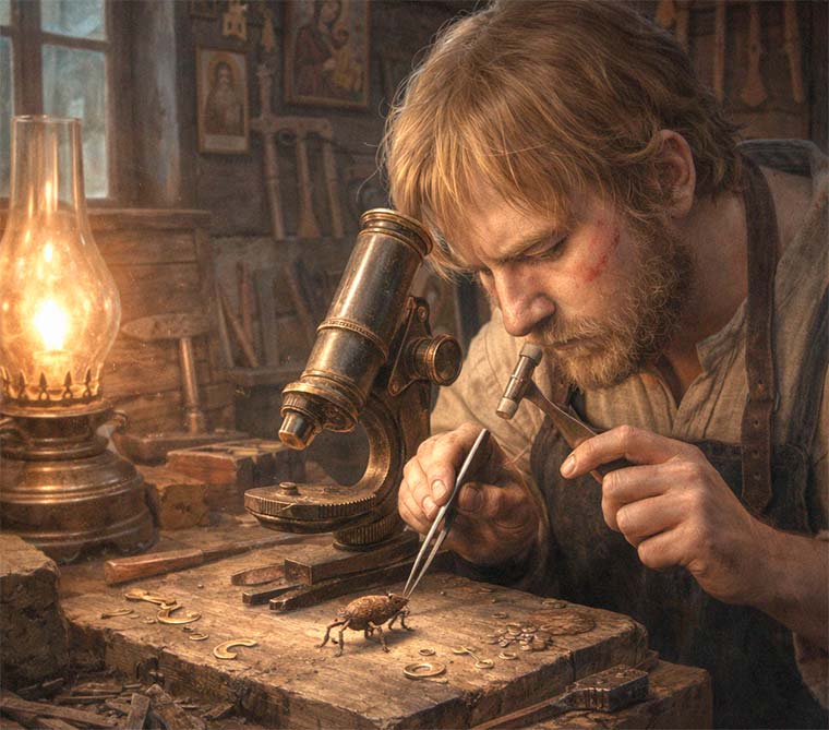 Тульские мастера учились с детства. Обучение было суровым: учеников били, заставляли работать по много часов. Поэтому в описании Левши есть деталь: "на висках волосья при ученье выдраны". Это значит, что мастер драл учеников за волосы, когда они ошибались.