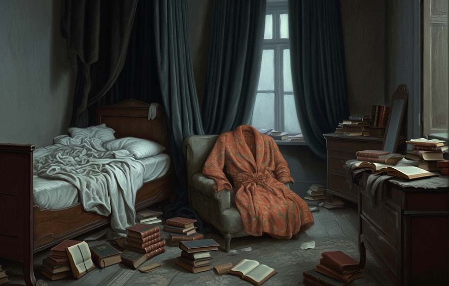 "В комнате пыль, паутина, прошлогодняя газета. Но это не просто беспорядок – автор говорит о "застывшем хаосе". Это показывает, что время для Обломова остановилось".