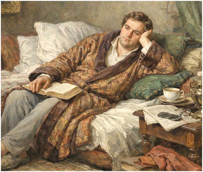 Жизнь персонажа Гончарова – розовые мечтания на мягком диване. Тапочки и халат – неотъемлемые спутники обломовского существования и яркие точные художественные детали, раскрывающие внутреннюю сущность и внешний образ жизни Обломова.