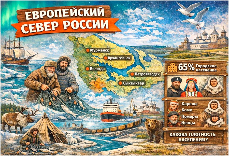 Материал предназначен для проверки знаний по теме населения Европейского Севера России. Задания охватывают историю освоения, этнический состав, расселение и функции городов региона.
