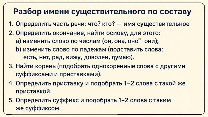 - Определить суффикс и подобрать 1–2 слова с таким же суффиксом.